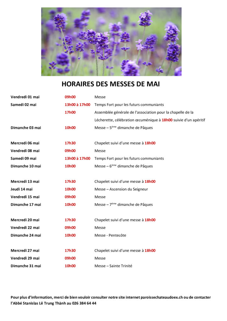 Horaires des messes – mai 2026 Publication publiée :27 avril 2026 Post category:Actualités / Horaires des messes