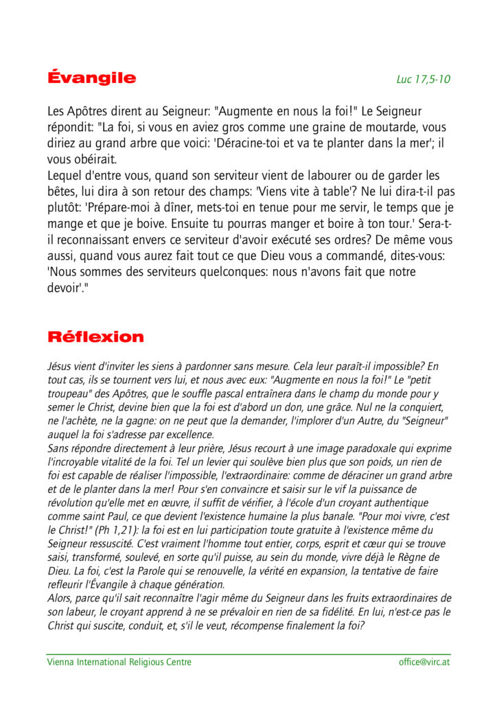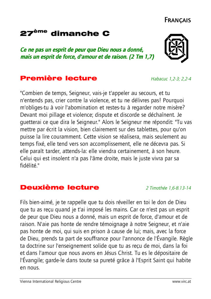 Lectures du 05 octobre 2025 (27ème dimanche du Temps Ordinaire, année C) Publication publiée :30 septembre 2025 Post category:Actualités Commentaire du jour: La Foi? Un peu? Beaucoup? Lectures selon le « Vienna International Religious Center » : Laisser un commentaire Annuler la réponseVous devez être connecté pour publier un commentaire.