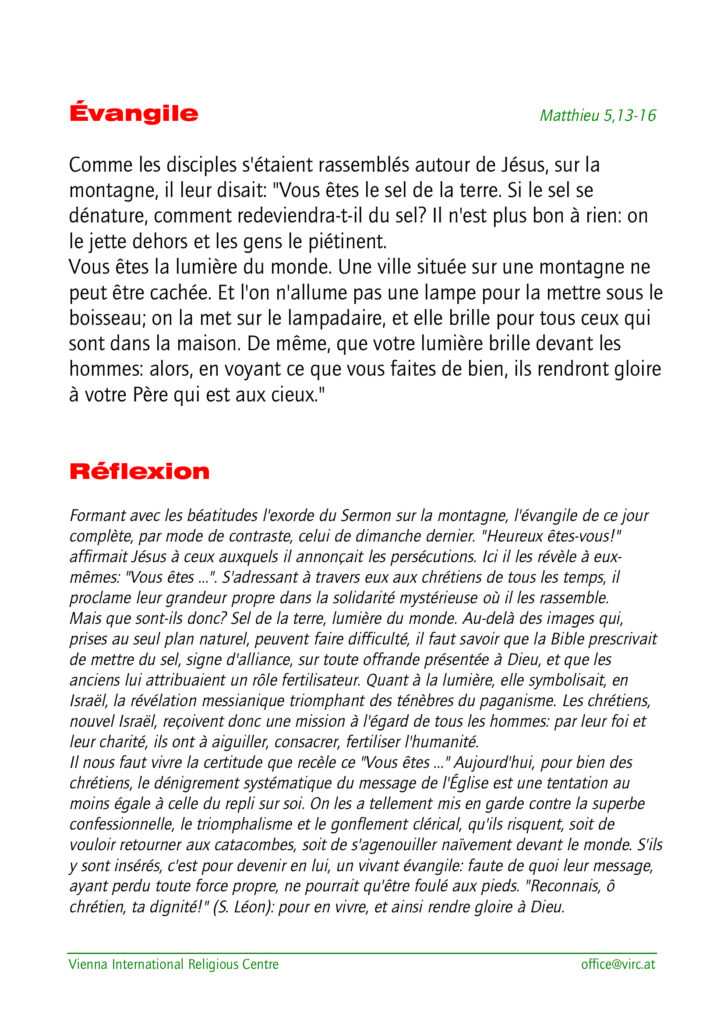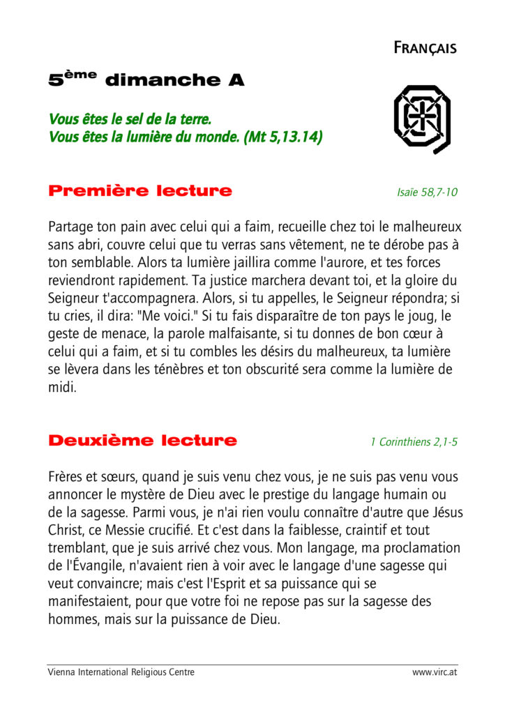 Lectures du dimanche 08 février 2026 (5ème dimanche du Temps Ordinaire, année A) Publication publiée :3 février 2026 Post category:Actualités Commentaire du jour: Sel et Lumière Lectures selon le « Vienna International Religious Center » : Laisser un commentaire Annuler la réponseVous devez être connecté pour publier un commentaire.