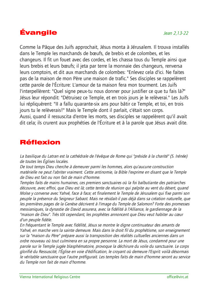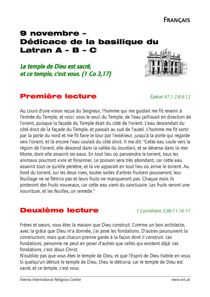 Lectures du dimanche 09 novembre 2025 – Dédicace de la basilique du Latran Publication publiée :4 novembre 2025 Post category:Actualités Lien vers le commentaire du jour: Les marchands du Temple Lectures selon le « Vienna International Religious Center » : Laisser un commentaire Annuler la réponseVous devez être connecté pour publier un commentaire.