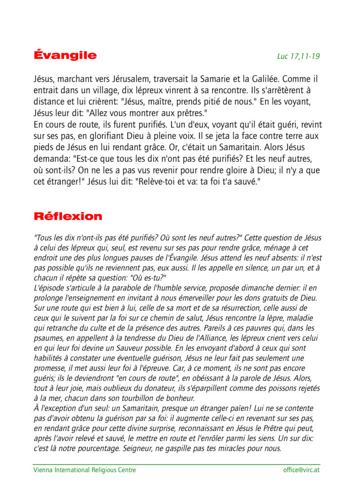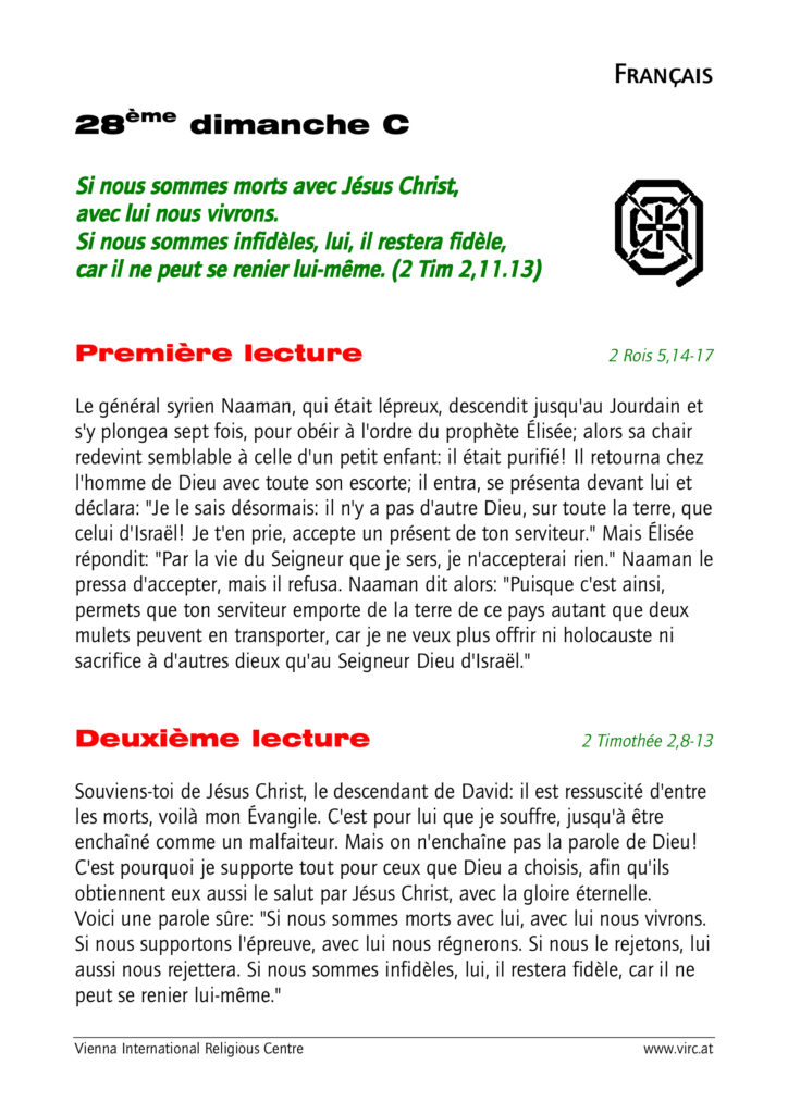 Lectures du dimanche 12 octobre 2025 (28ème dimanche du Temps Ordinaire, année C) Publication publiée :7 octobre 2025 Post category:Actualités Commentaire du jour: Avez-vous oublié Jésus Lectures selon le « Vienna International Religious Center » : Laisser un commentaire Annuler la réponseVous devez être connecté pour publier un commentaire.