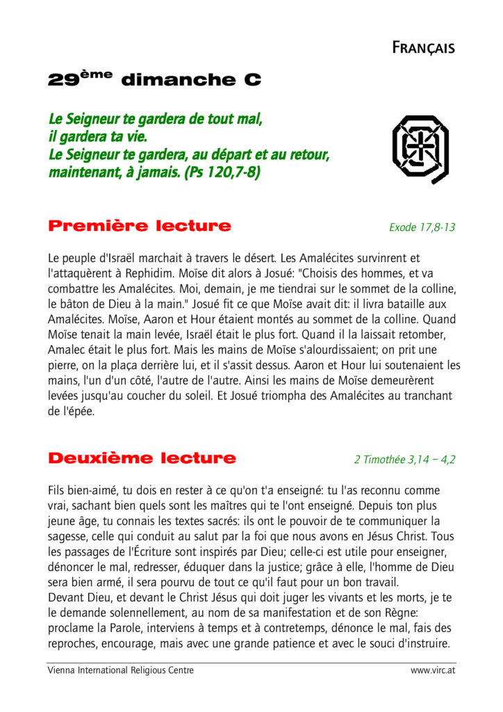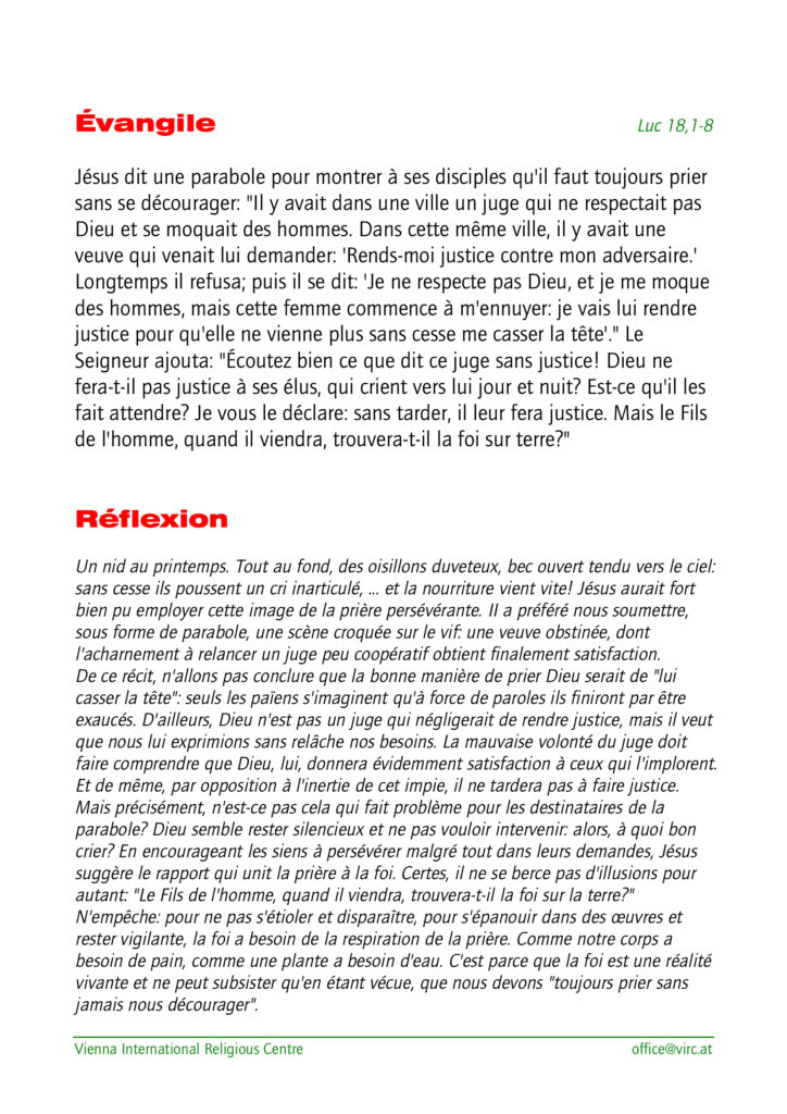 Lectures du dimanche 19 octobre 2025 (29ème dimanche du Temps Ordinaire, année C) Publication publiée :14 octobre 2025 Post category:Actualités Commentaire du jour: Attendez-vous que justice soit faite? Lectures selon le « Vienna International Religious Center » : Laisser un commentaire Annuler la réponseVous devez être connecté pour publier un commentaire.