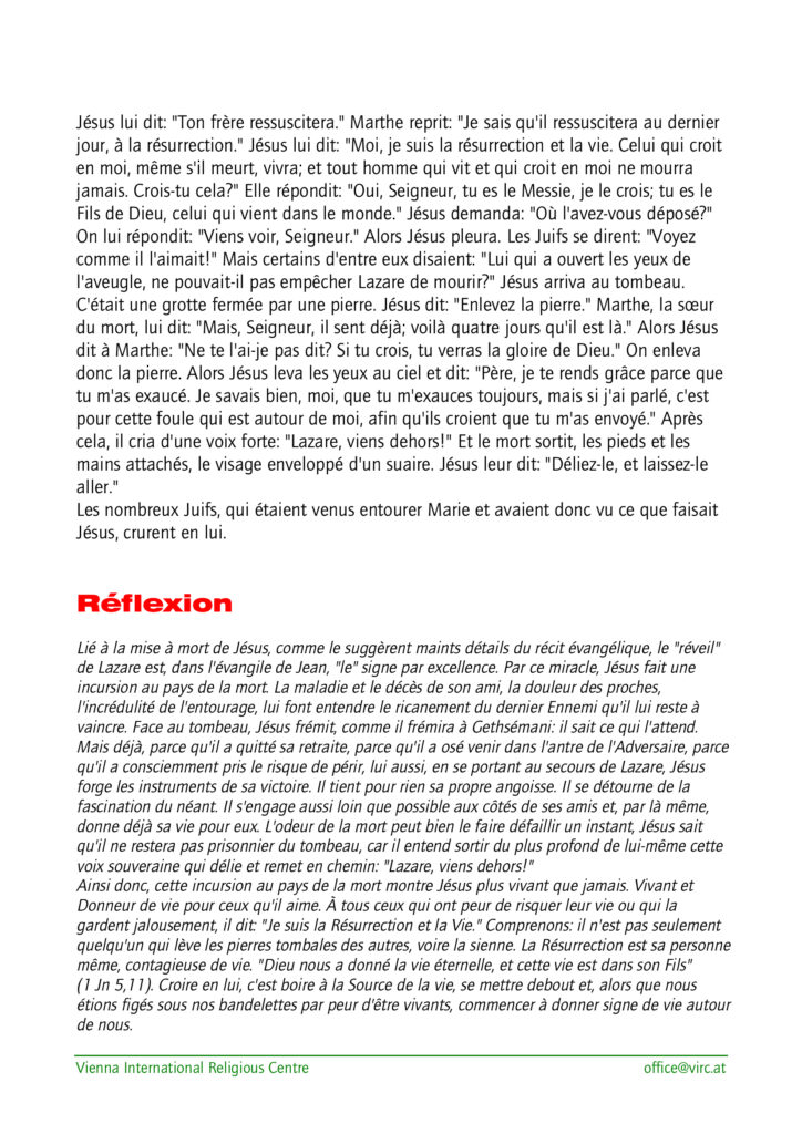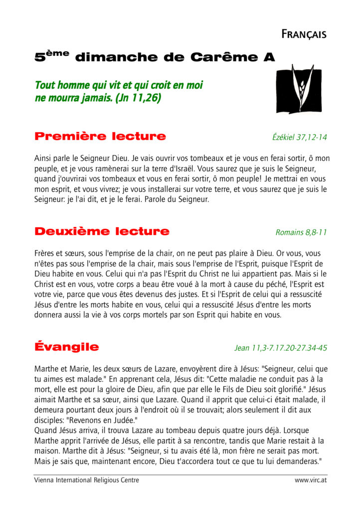 Lectures du dimanche 22 mars 2026 (5ème dimanche de Carême, année A) Publication publiée :17 mars 2026 Post category:Actualités Lien vers le commentaire du jour: Alors Jésus pleura Lectures selon le « Vienna International Religious Center »: Laisser un commentaire Annuler la réponseVous devez être connecté pour publier un commentaire.