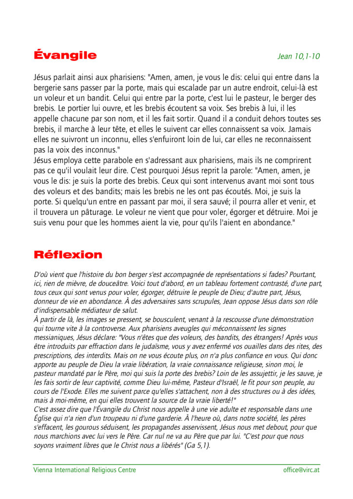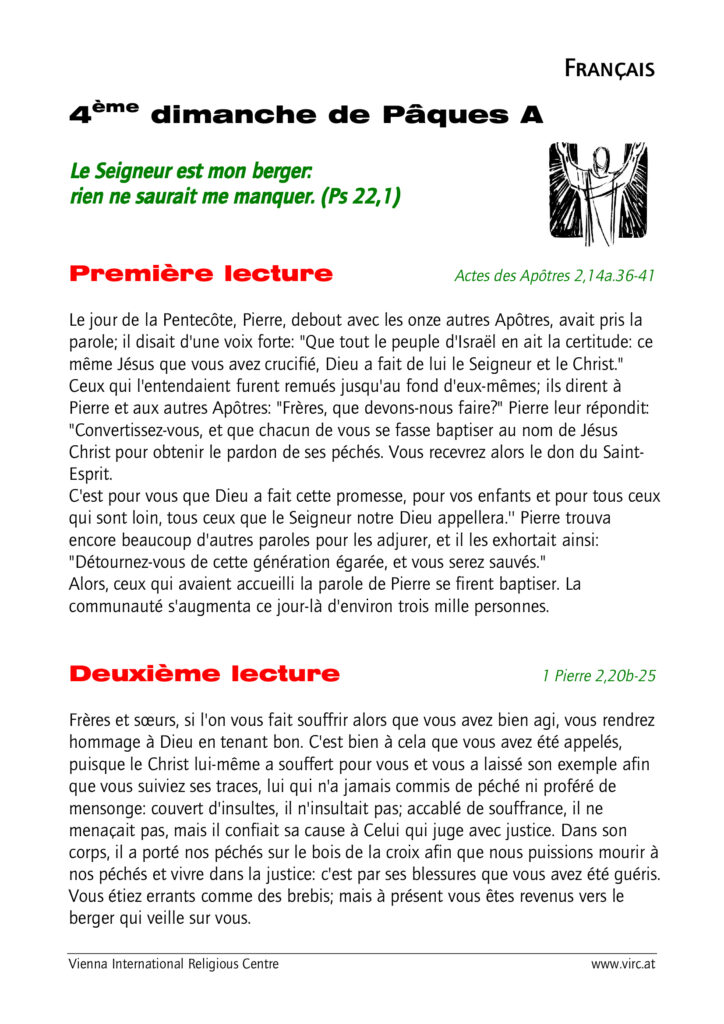 Lectures du dimanche 26 avril 2026 (4ème dimanche de Pâques, année A) Publication publiée :21 avril 2026 Post category:Actualités Lien vers le commentaire du jour: Jésus, le vrai Messie Lectures selon le « Vienna International Religious Center » : Laisser un commentaire Annuler la réponseVous devez être connecté pour publier un commentaire.