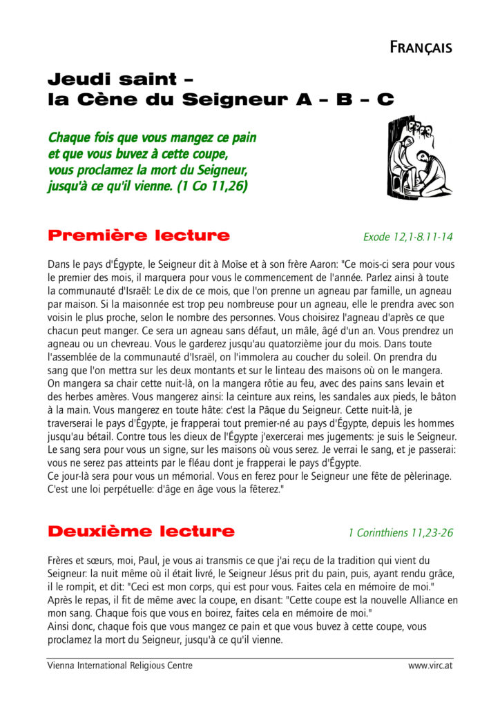 Jésus, réunit ses apôtres pour la Pâque juive, mais il donne à certains rites une nouvelle signification: le lavement de mains devient lavement de pieds ; le pain azyme distribué par le père de famille est partagé par Jésus en signe de son corps livré ; la coupe de bénédiction est bue en signe de son sang versé ; il est, lui Jésus, l’Agneau immolé.