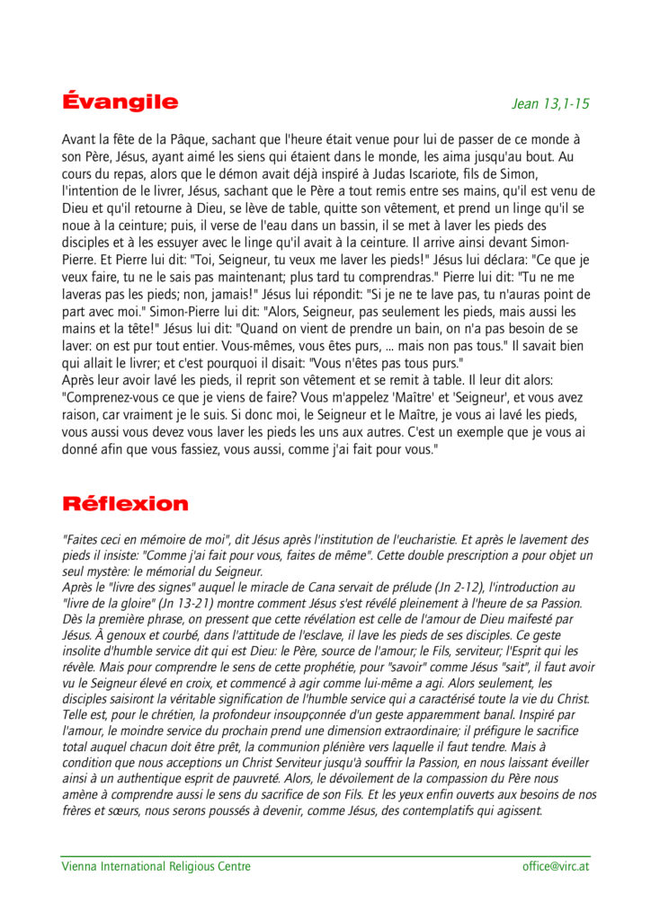 Jean a relaté seulement le lavement des pieds, alors que les autres évangélistes ont transmis l’institution de l’Eucharistie. Ce choix n’est pas le récit d’une autre Cène. Le lavement des pieds et l’eucharistie sont l’expression du même don total que Jésus fait de lui-même et de sa vie pour le salut du monde. Les deux signes sont la mémoire de l’amour du Christ jusqu’à l’extrême. Le service est indissolublement lié à l’Eucharistie comme les deux pages d’un même feuillet. Être pratiquant ne consiste pas seulement à aller à la messe : il faut aussi communier à la détresse et aux besoins de ceux que la vie malmène. Le service est eucharistie quand il est visite de malades, attention fraternelle vis-à-vis des SDF et des étrangers, service de table aux restaurants du cœur ou don de meubles à une famille démunie de tout.